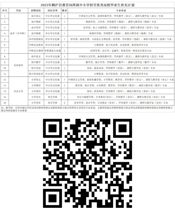 根据《杭州市事业单位公开招聘工作人员操作程序(试行)》(杭人社发〔2014〕380号)、《桐庐县事业单位公开招聘人员暂行规定》(桐政办〔2008〕60号)的有关规定,本次招引被聘用人员均纳入事业编制,结合我县2023学年教育事业发展规划需补充招引部分岗位,计划如下: