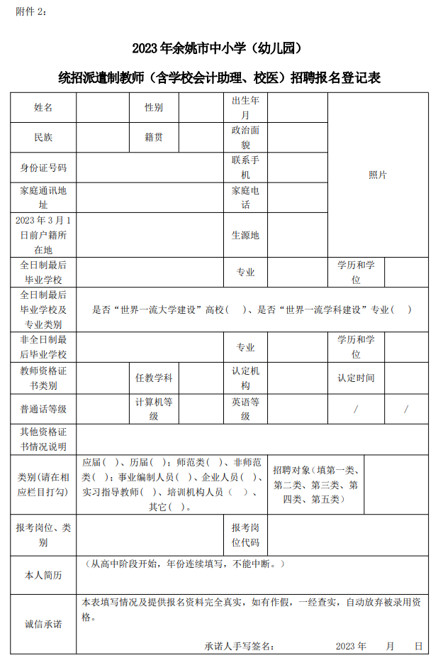 附件2:2023年余姚市中小学(幼儿园)统招派遣制教师(含学校会计助理、校医)招聘报名登记表.png