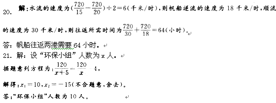 20.甲、乙两港相距720千米,轮船往返两港需要35小时,逆流航行比顺流航行多花5小时,帆船在静水中每小时行驶24千米,问帆船往返两港需要多少小时?(8分)
