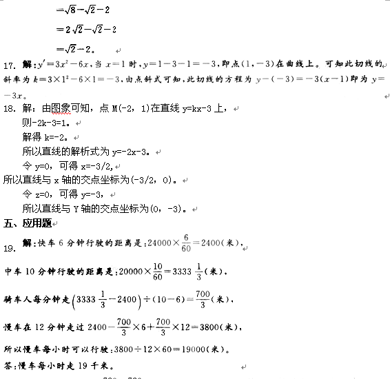 19.快、中、慢三辆车同时从同一地点出发,沿同一公路追赶前面的一个骑车人,这三辆车分别用6分钟、10分钟、12分钟追上骑车人。现在知道快车每小时走24千米,中车每小时走20千米,那么,慢车每小时走多少千米?(8分)