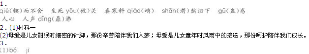 1.(1)宁静平和(幽美);(2)展示人物活动环境特点;衬托人物美丽和充满母爱的性格(心灵)。(3)因为母亲能“把深沉的爱包容在静静的等待中”,而我还未能。